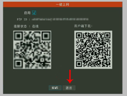 3.清除设备ID。点击NVR右上角的二维码图标,在二维码界面下方找到"退出"按钮,长按该按钮30秒以上,松开鼠标后,NVR黑屏重启(或弹出删除提示)。